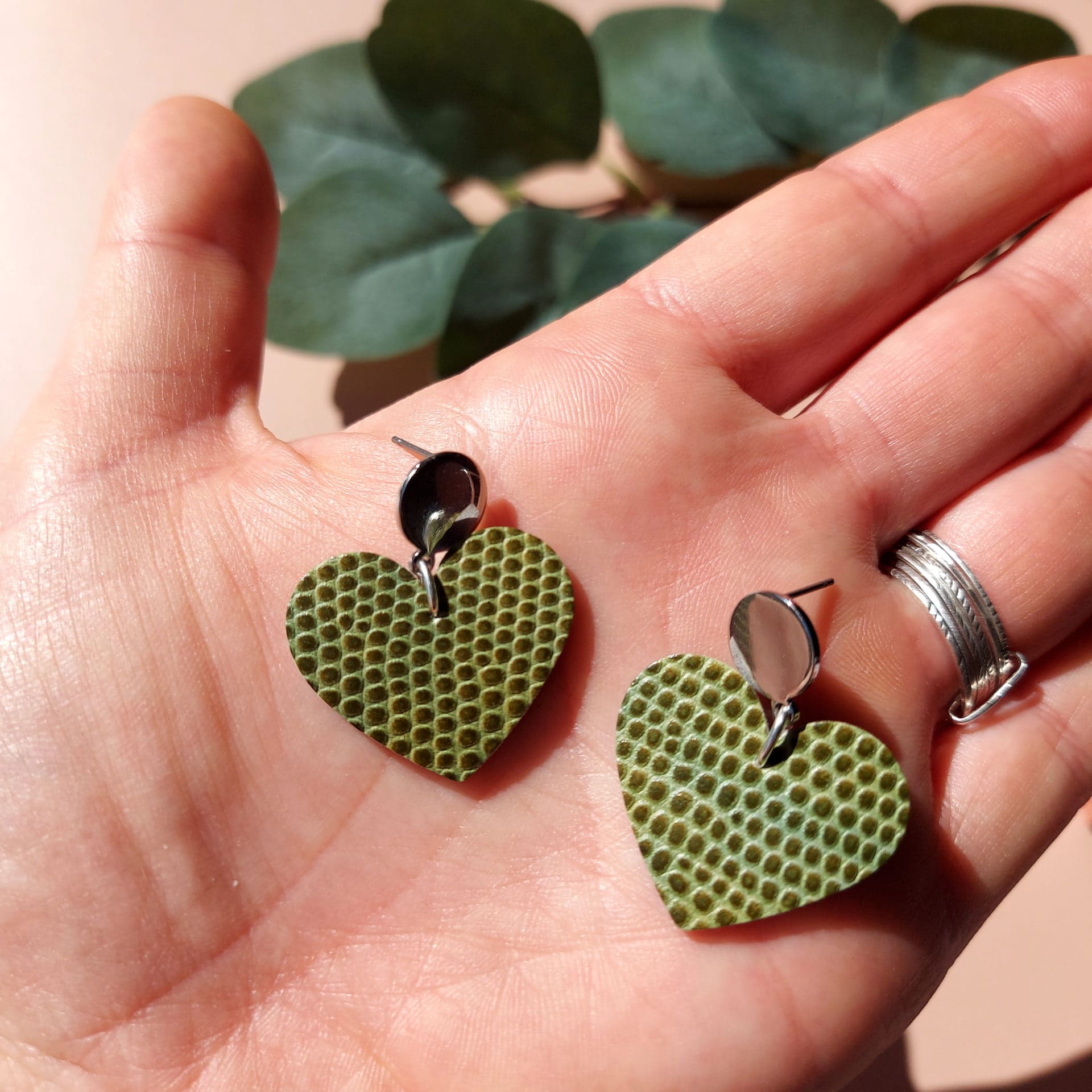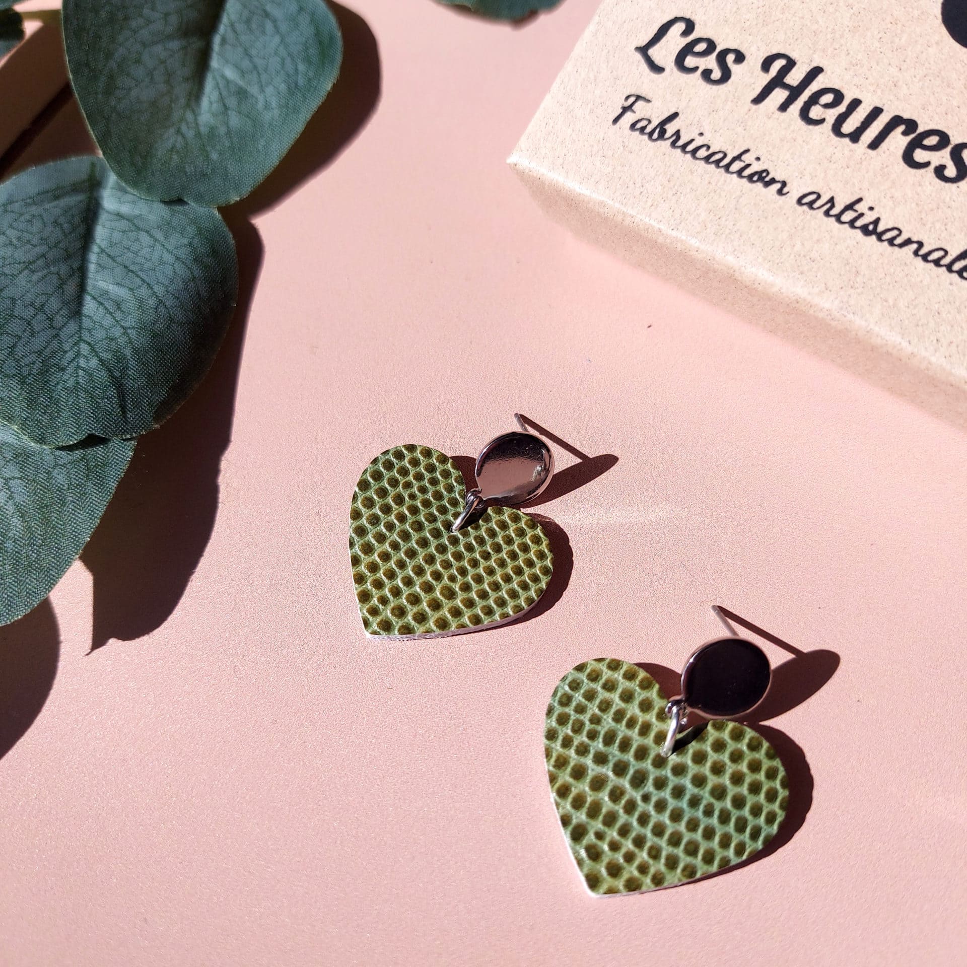 Des boucles d’oreilles éco-responsables en cuir vert clair. En forme de coeur pour des femmes bienveillantes! Cadeau idéal. Fabriquées en Deux-Sèvres en toute petite quantité.