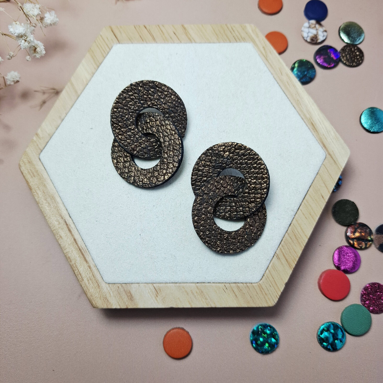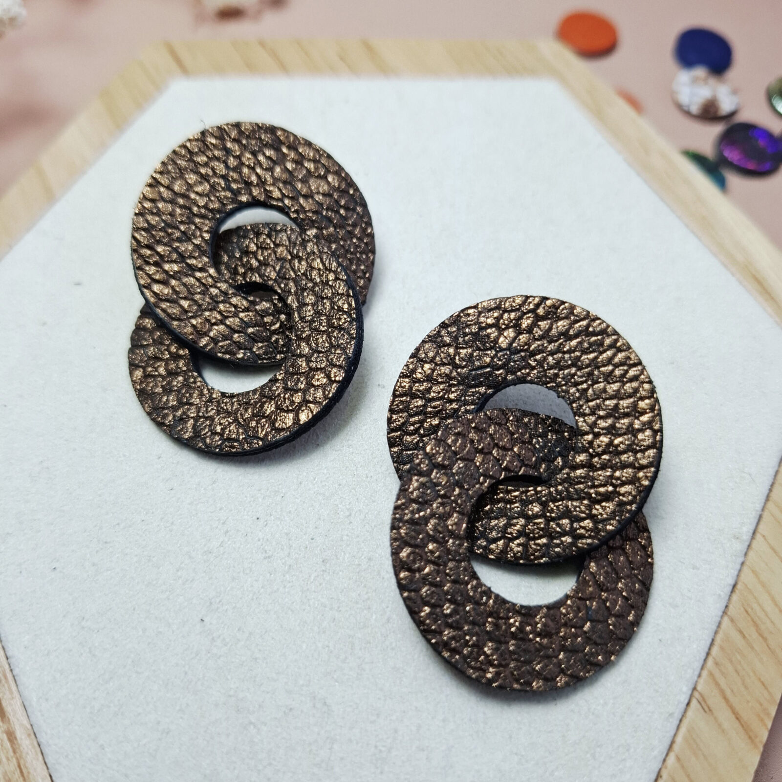 Boucles d’oreilles cuir bronze texturé. Deux anneaux enlacés, du mouvement, du caractère. Affirmez votre style et votre amour du fait main.