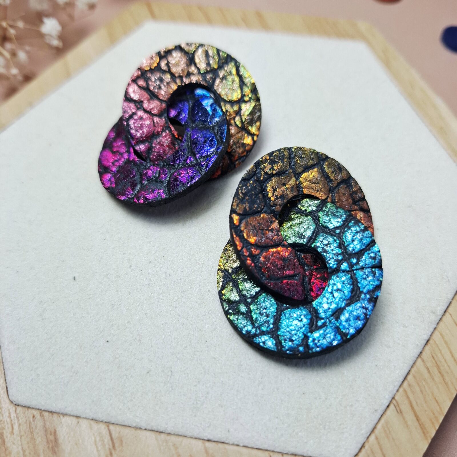Boucles d’oreilles cuir multicolore et irisé ultra-légères. Deux anneaux enlacés, du mouvement, du caractère. Assumez votre style. Fait main.