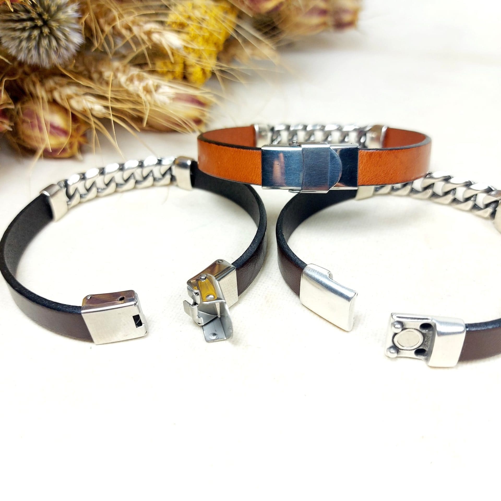 Bracelet cuir gourmette pour homme : élégance et simplicité en 3 coloris. Le mariage parfait entre métal et cuir ! A découvrir de toute urgence.