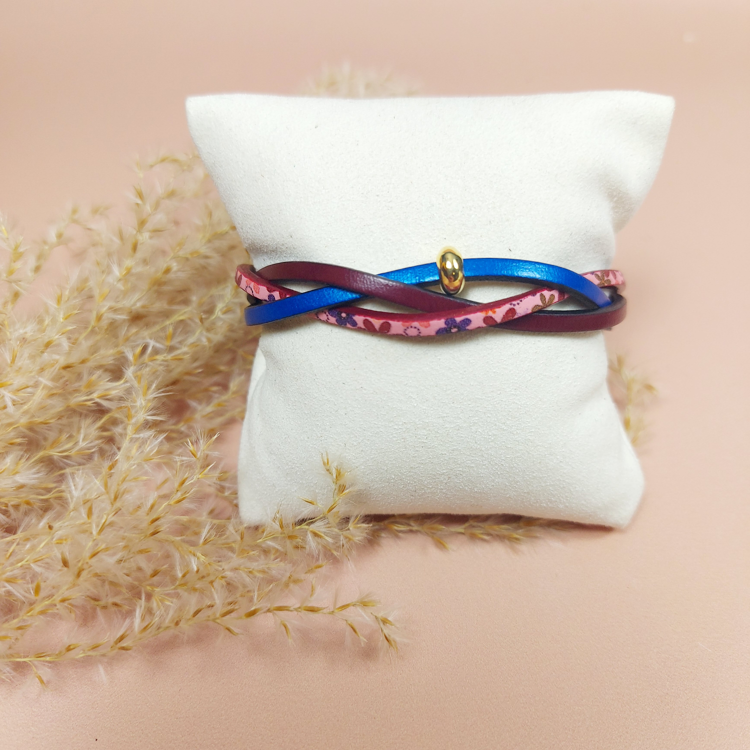 Soyez le premier à laisser votre avis sur “Bracelet 3 brins entrelacés bleu, prune et fleuri”
