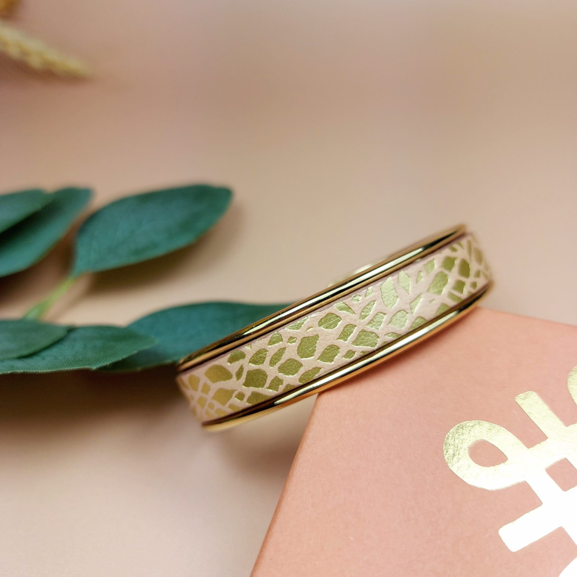 Un océan de douceur et de tendresse vient se déverser sur votre poignet avec ce bracelet jonc doré à l’or fin orné d’un cuir nude et or. Hypoallergénique. Fabrication artisanale française.