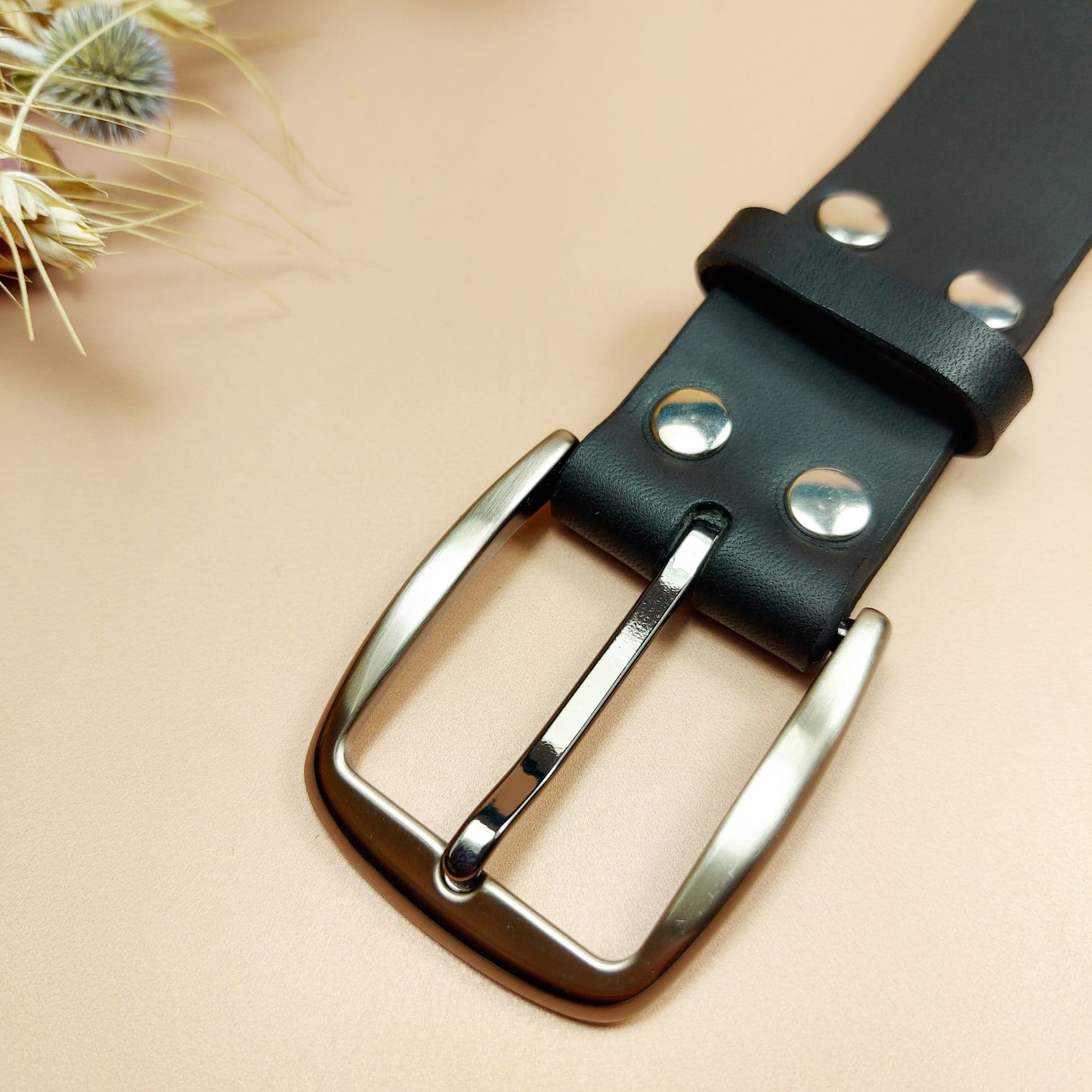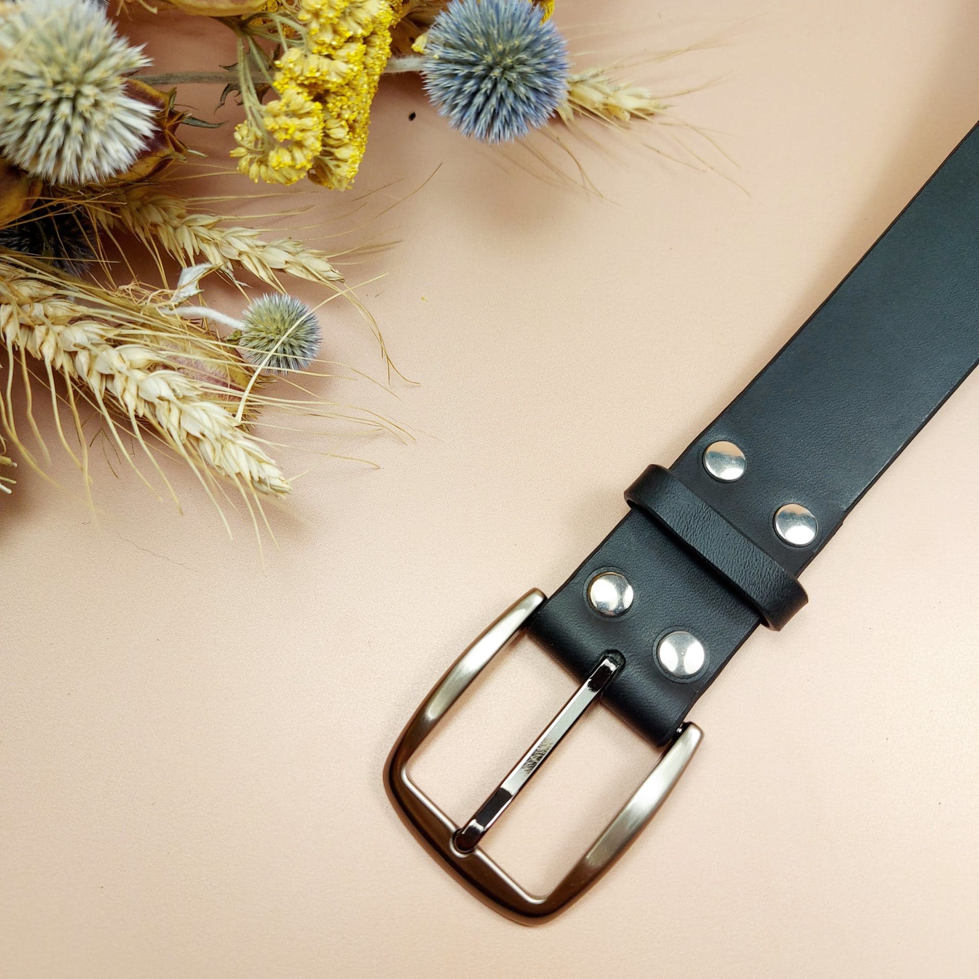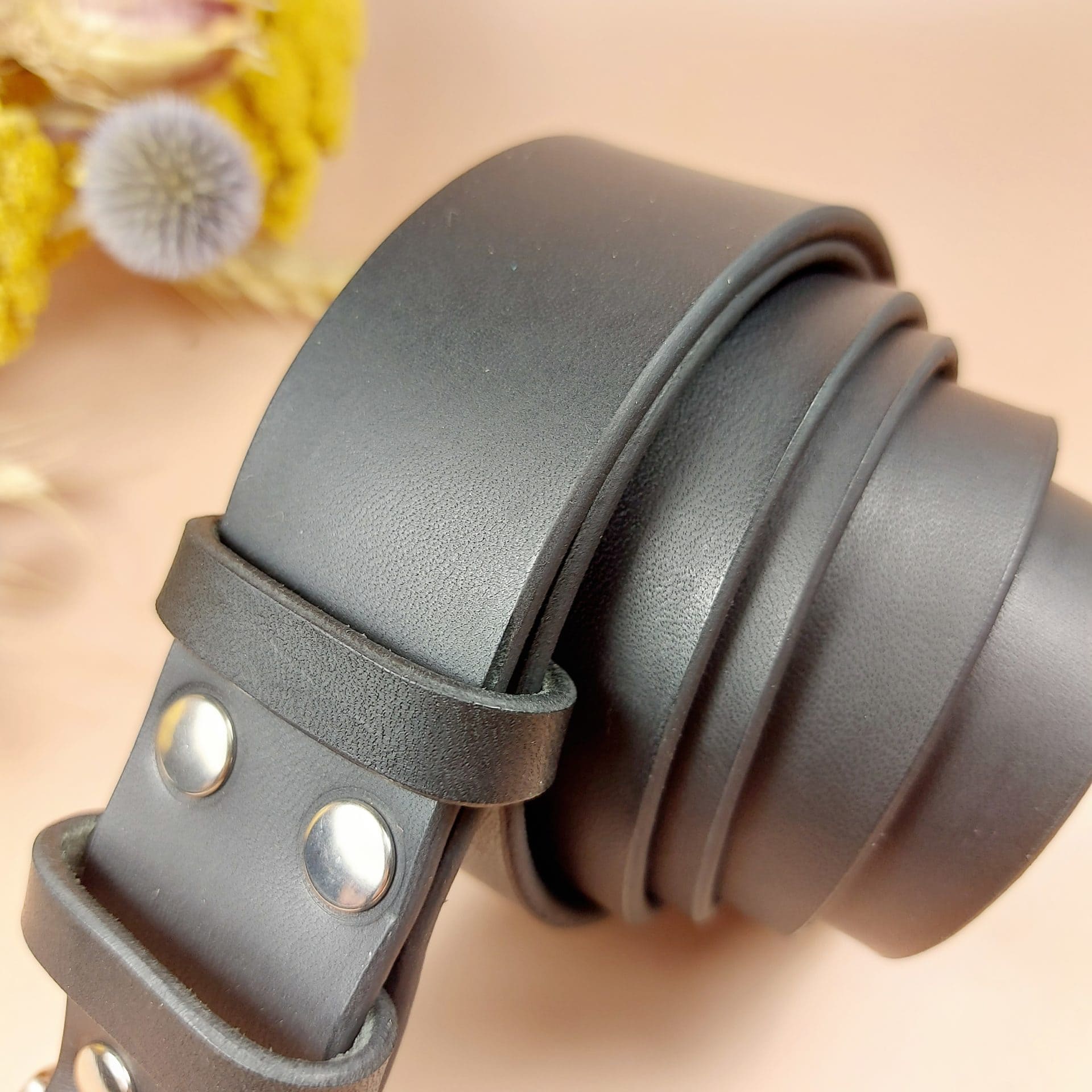Ceinture noire en cuir entièrement faite à la main en France. Réalisée sur-mesure, pour les hommes qui ont une sensibilité écologique.