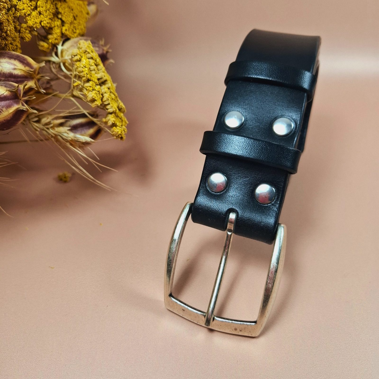 Ceinture large en cuir noir, élégante et robuste. Fabriquée à la main, ajustée sur mesure, conçue pour durer des années.